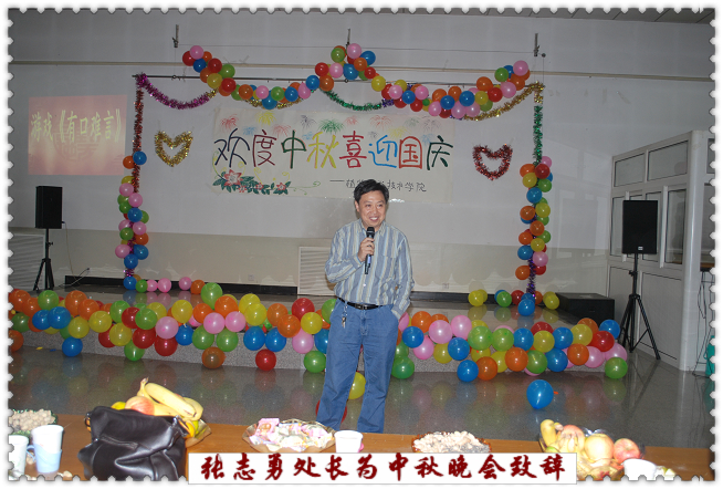 张志勇处长在晚会上致辞。在中秋佳节和建国61周年来临之际,他祝全院师生员工节日快乐,身体健康。他说,来自五湖四海的老师、同学们,为了共同的理想,有缘会聚到122cc太阳成集团这个大家庭,为她奉献,为她争光。他希望,在今后的日子里,全体师生员工就像今天的中秋晚会主题一样,始终能够亲如一家,同心同德,共同努力,把学院这个大家庭建设的更加美好。