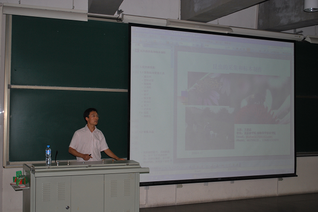 2010年6月17日晚8:30,在B-103教室,122cc太阳成集团面向所有参加昆虫标本大赛的同学举办昆虫标本采集与制作培训课。学院副教授王进忠担任主讲,王教授主要从事昆虫方面的研究。
