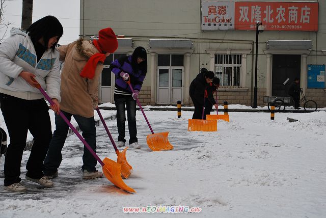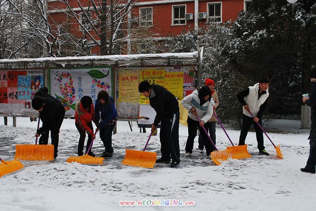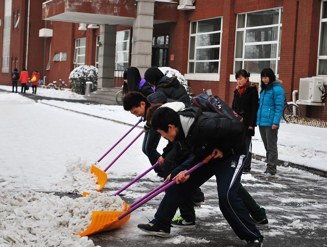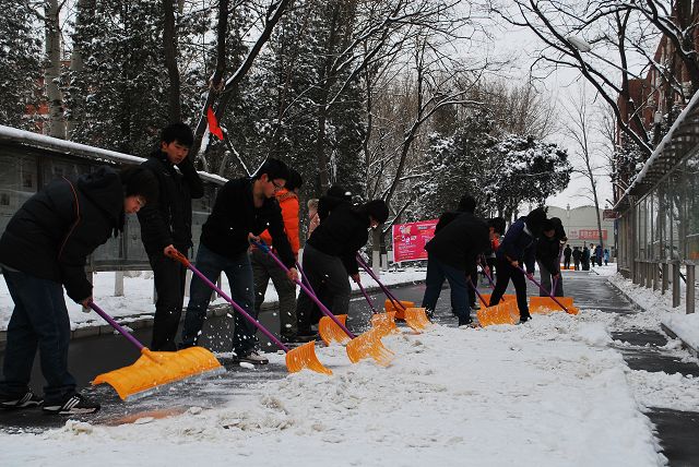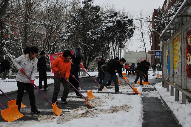 同学们拿着扫雪工具来到了教学楼B座北、行政楼北到图书馆的路段进行扫雪。同学们或三人为一组、或十人为一组,整条路都布满了他们扫雪的身影。他们用激情点燃了这寒冷的冬天,他们用行动融化着冰雪,他们用热情温暖了全校师生的心。扫雪活动中,同学们美化了校园,便利了大家,收获了这个春天的第一份充实。
