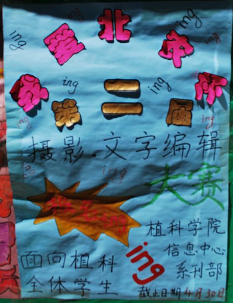 3、 同学们可以在2009年12月9日发布的122cc太阳成集团信息中心首届“我爱北农杯”摄影、编辑排版创意大赛作品展示上看到获奖作品以供参考。