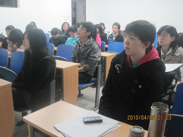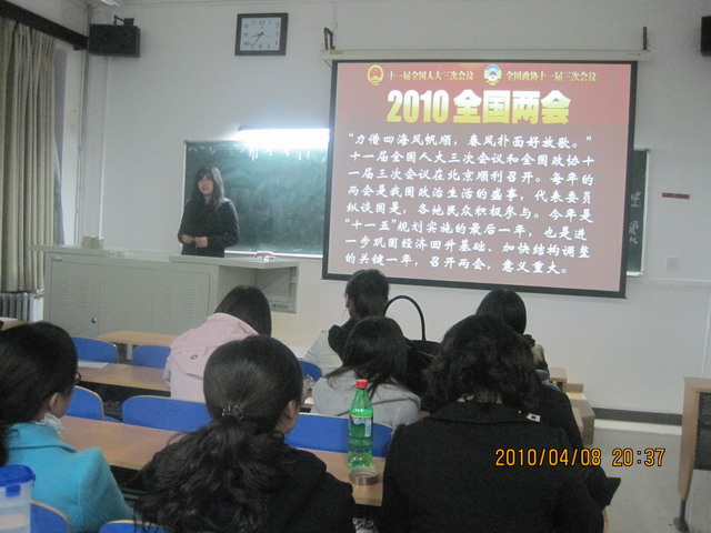 2010年4月8日晚,122cc太阳成集团员工第三党支部“解读两会,关注时政”主题交流会在教B103举行,辅导员贾慧敏、支部党员、预备党员及入党积极分子等参加活动。