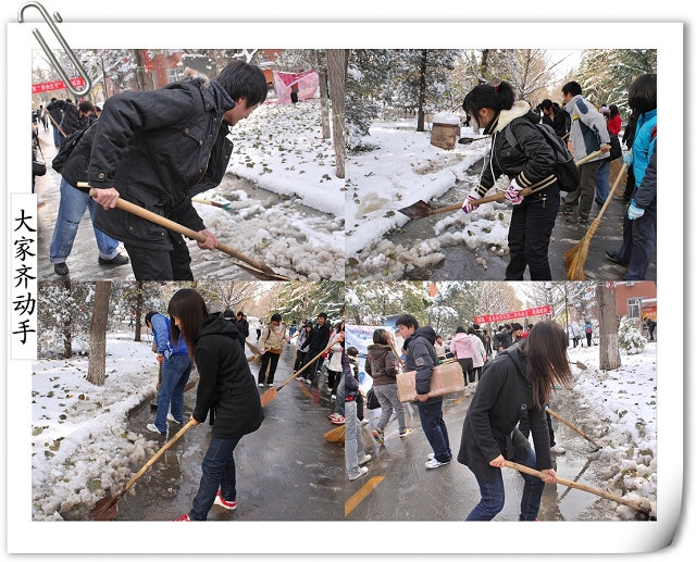 师生齐动员的场景引得路人的赞叹,同时得到后勤集团及公司个别部门的支持,为大家提供铁锹、铁锨、扫把等工具。争先恐后、你帮我扶,在大家半个小时的努力下,通往办公楼的南北路、去往一二食堂的大道小路、图书馆门前,变得畅通无阻,消融的积雪不再侵蚀师生的鞋子,而成为树木的最好浇灌积水,灿烂的笑容、师生互助的情景,成了今天别样美丽的风景线,更多的是为全校师生的工作和学习带来了方便。