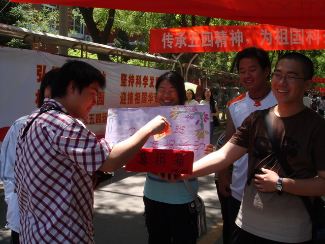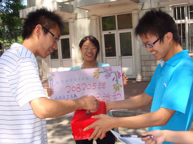 12日中午,208205支部团员在礼堂与教学楼B座之间的十字路口开展募捐活动,号召来往的同学为农民工子弟捐款捐物。206级同学徐润墨还特地从宿舍收拾出近期的图书刊物捐赠到募捐地点。路过的同学也纷纷慷慨解囊献上自己的一份爱心。当日募捐活动结束后,团支书曹晶用募捐来的款项购买了笔记本转笔刀等文具,精心包装后准备送给红星子弟公司的员工。