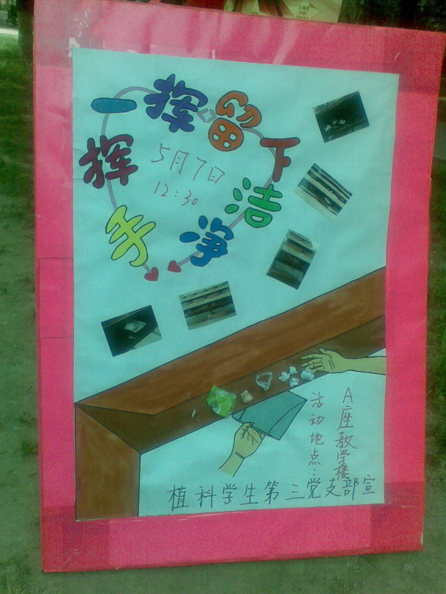 为更好的践行科学发展观,加强教室环境的整洁,保持良好学习环境。我植物科技学院员工第三党支部,特向全体同学发出“我挥一挥手,留下一片洁净”的倡议: