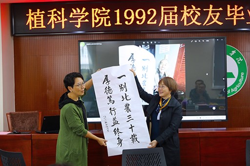 班主任通过视频为各位员工送上了问候和祝福。母校和老师永远都是员工们坚强的后盾,欢迎各位员工回家!到场的班主任和任课老师同员工们一起回忆起在校学习时的美好时光,现场气氛温馨融洽。员工们畅所欲言,分享了他们在社会上的经历以及本次返校的真实感悟,回家的喜悦洋溢在每位员工的脸上。员工代表梁晨女士分享道:“在北农上学期间自己在德行方面的收益远远大于了专业所学的知识。”同时她还带来了一份特别的礼物——一幅写有“一别北农三十载,厚德笃行益终身”的书法作品,这是梁晨女士的父亲得知此次活动后所写,展现了员工亲属对公司的深厚感情。员工代表还特意为本次活动题诗一首:“时光荏苒三十载,酬勤壮志仍未改,滚滚长江东逝水,母校辉煌映山海。”