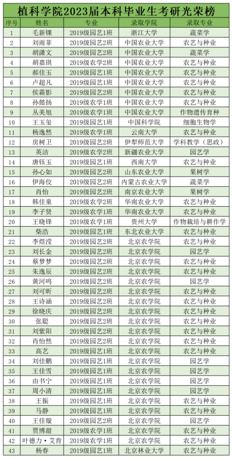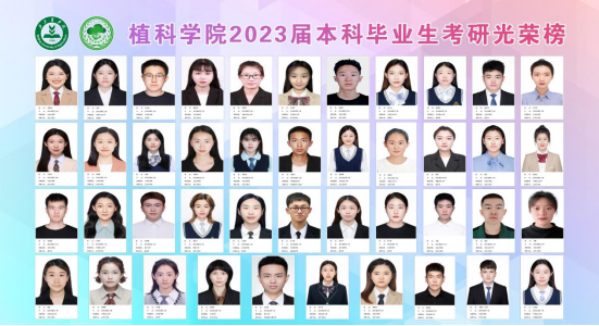 2023届本科毕业生131人,考研上岸人数43人,其中985院校上岸9人,涉及浙江大学、中国农业大学;211院校上岸6人,涉及北京林业大学、贵州大学、西南大学、南京农业大学、云南大学、东北农业大学;双一流院校2人,涉及华南农业大学等院校。千淘万漉虽辛苦,吹尽狂沙始到金。祝贺2023届考研学子取得佳绩,愿大家在今后的学习生活中继续努力,乘风破浪,未来可期。