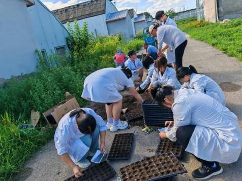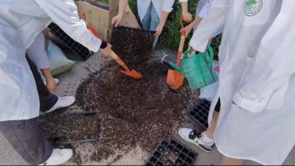 在刘建伟经理和杨老师的指导下,实践团成员们撸起袖子开始进行实践操作,对种子进行播种育苗,在此过程中,刘经理向成员们讲解了育苗中对基质配比、水分含量 、播种和覆土厚度等操作要求 ,针对如何保证育苗基质处于半湿半干状态,如何保护种子、缩短育种时间给同学们进行了专业的指导。同时,同学们体验了用浇水装置“花洒”给穴盘中种子浇水的辛苦 ,掌握了“花洒”孔经过特殊处理和滴落时不易压弯压倒育苗的实践经验。在农耕劳作时间,实践团也与刘经理进行了深入交流,对节能减排的“铝箔槽”无土栽培技术要点进行了讨论,探索更多助农技术。成员们通过农耕体验,进一步将课堂所学专业知识转化到实际生产中,同时希望自己种下的小小种子,为园区带来更多的成果。