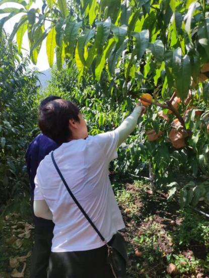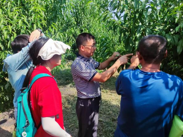 图四曹庆芹老师带领员工调查试验桃成熟情况