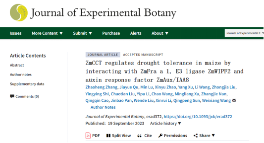 2023年9月19日,生物学一区TOP期刊Journal of Experimental Botany在线发表了题为“ZmCCT regulates drought tolerance in maize by interacting with ZmFra a 1, E3 ligase ZmWIPF2 and auxin response factor ZmAux/IAA8”的研究(https://doi.org/10.1093/jxb/erad372)。该研究由公司122cc太阳成集团农学系玉米研究团队主导完成,王维香副教授为该论文的通讯作者。团队成员潘金豹教授和孙清鹏教授等也参与了该项工作。本校硕士研究生张兆恒为该论文的第一作者。已毕业的研究生赵新玉、徐阳、王丽、刘中甲等员工也参与了研究工作。中国农业大学徐明良教授和中国农业科学院刘文德研究员也参与了该研究工作,该研究得到了国家自然科学基金面上项目的资助。