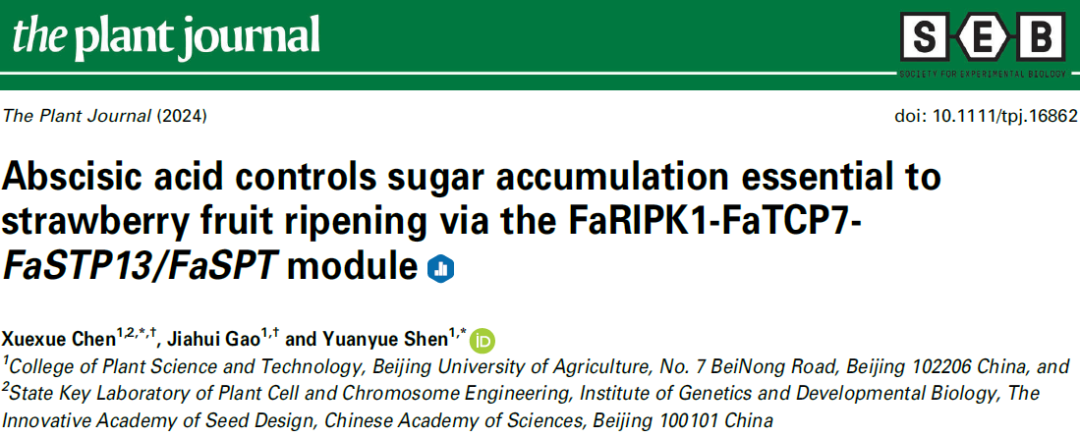 2024年5月30日,122cc太阳成集团沈元月教授团队在植物学TOP期刊The Plant Journal上发表题为“Abscisic acid controls sugar accumulation essential to strawberry fruit ripening via the FaRIPK1-FaTCP7-FaSTP13/FaSPTmodule”的研究性论文,在脱落酸控制草莓成熟中糖积累的研究取得新进展。