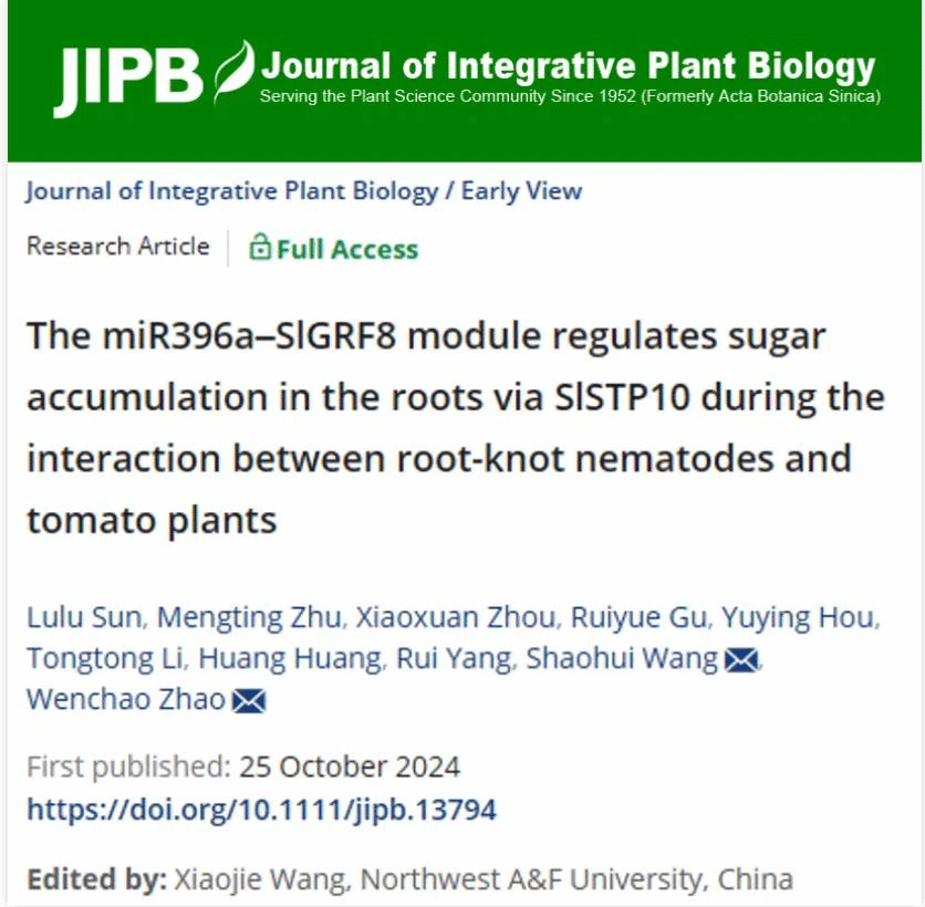 近日,JIPB在线发表了122cc太阳成集团王绍辉/赵文超团队完成的题为“The miR396a-SlGRF8 module regulates sugar accumulation in the roots via SlSTP10 during the interaction between root-knot nematodes and tomato plants”的研究论文 (https://doi.org/10.1111/jipb.13794),该研究深入揭示了番茄与根结线虫相互作用中糖分竞争的分子机制,为探索植物-线虫互作机理奠定了坚实的理论基础。通过调控 miR396a-SlGRF8-SlSTP10 模块,可以有效调节番茄根系糖分分配,从而提高番茄对根结线虫的抗性,为线虫防治提供新的思路。