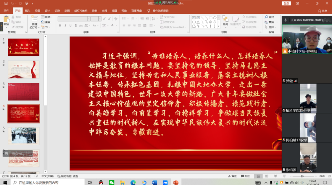 在五四青年节即将到来之际,习近平总书记来到中国人民大学考察调研,他指出,立足新时代新征程,中国青年的奋斗目标和前行方向归结到一点,就是坚定不移听党话、跟党走,努力成长为堪当民族复兴重任的时代新人。122cc太阳成集团团委组织各团支部开展“学习习近平总书记考察中国人民大学时发表的重要讲话”主题团日活动。习总书记的重要讲话引发了同学们的强烈反响,大家表示在今后要坚定不移听党话、跟党走,为中华民族的伟大复兴作出自己的贡献。