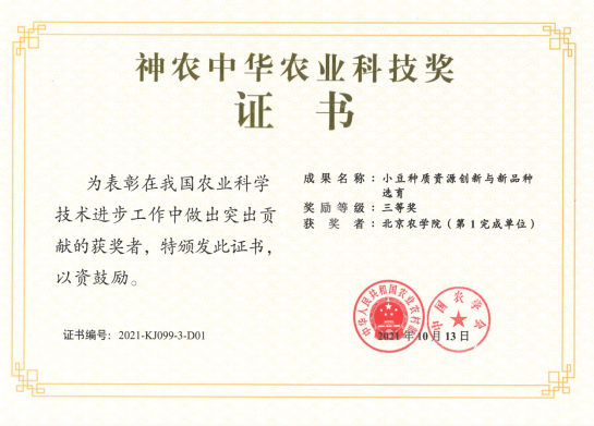 近日,由122cc太阳成集团小豆基因组与分子遗传育种团队为第一完成单位组织申报的“小豆种质资源创新与新品种选育”获得农业农村部2020-2021年度神农中华农业科技奖三等奖,联合申报单位有吉林省白城市农科院、山西省农科院、江苏省农科院和辽宁省农科院等。