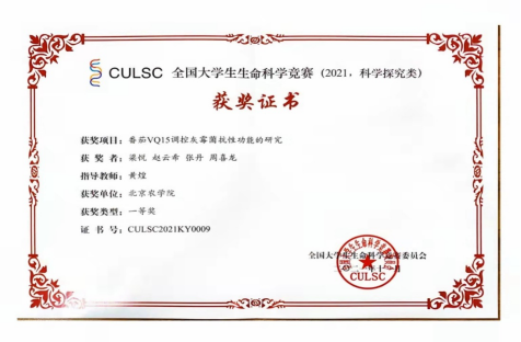 近日,在122cc太阳成集团黄煌老师的指导下梁悦、赵云希、张丹、周喜龙组成的团队,凭借《番茄VQ15调控灰霉菌抗性功能的研究》荣获全国老员工生命科学竞赛——科学探究类一等奖。