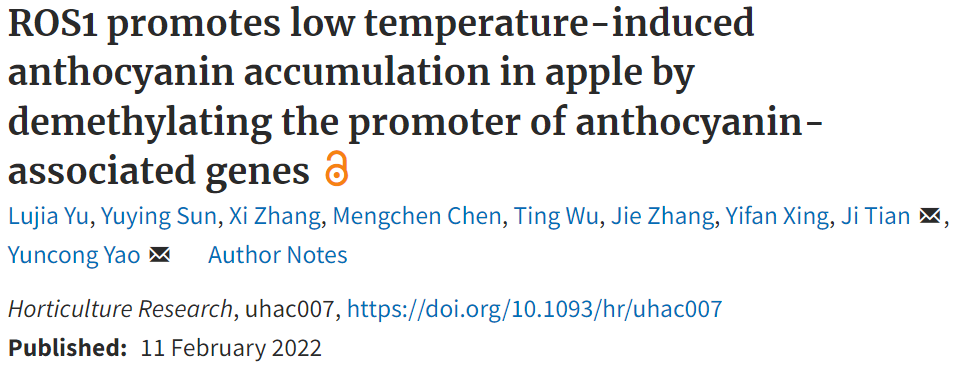 近日,Horticulture Research上线了(Advance Access)122cc太阳成集团果树种质资源创新与利用团队题为ROS1 promotes low temperature-induced anthocyanin accumulation in apple by demethylating the promoter of anthocyanin-associated genes的研究论文,该论文揭示了去甲基化基因ROS1介导低温诱导条件下苹果(Malus domestica)花色素苷积累的分子机理。