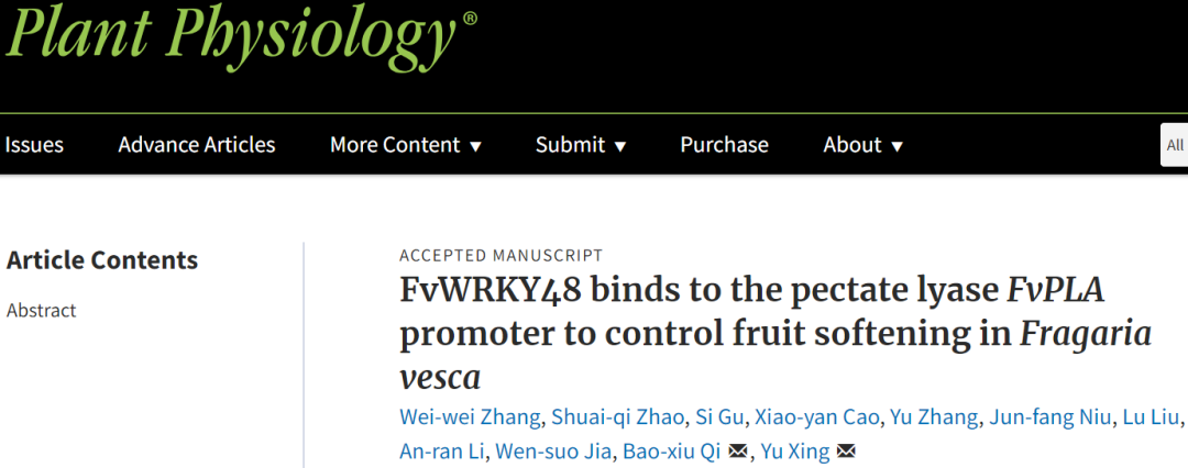 2022年3月3日,Plant Physiology在线发表了122cc太阳成集团、林木分子设计育种高精尖创新中心邢宇教授团队题为“FvWRKY48 binds to the pectate lyaseFvPLApromoter to control fruit softening inFragaria vesca”的研究论文,林木分子设计育种高精尖创新中心/英国利物浦约翰摩尔斯大学药学和生物分子学院终身教授亓宝秀为论文共同通讯作者。该研究发现FvWRKY48转录因子通过与果胶裂解酶基因FvPLA启动子结合以促进其表达,从而加速野生草莓的果胶降解和果实软化。