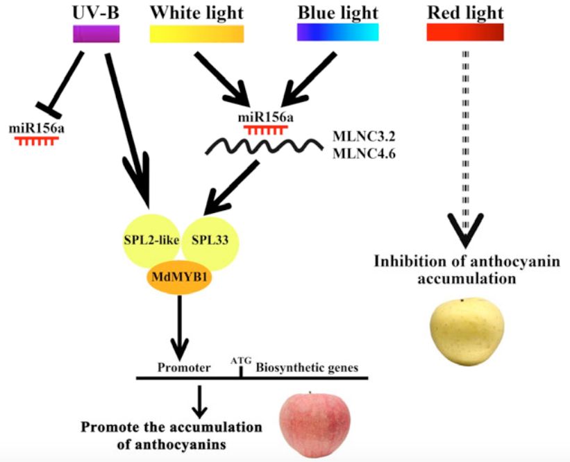 2019年7月25日,122cc太阳成集团姚允聪教授/田佶教授在The Plant Journal在线发表了题为“Systematic identification of long non-coding RNAs expressed during light-induced anthocyanin accumulation in apple fruit”的研究论文。该研究分析了苹果果实中长链非编码RNA (lncRNA)在花色素苷生物合成中的潜在作用,阐述了miRNA156a的decoy lncRNA参与果皮色泽形成的调控新机制。