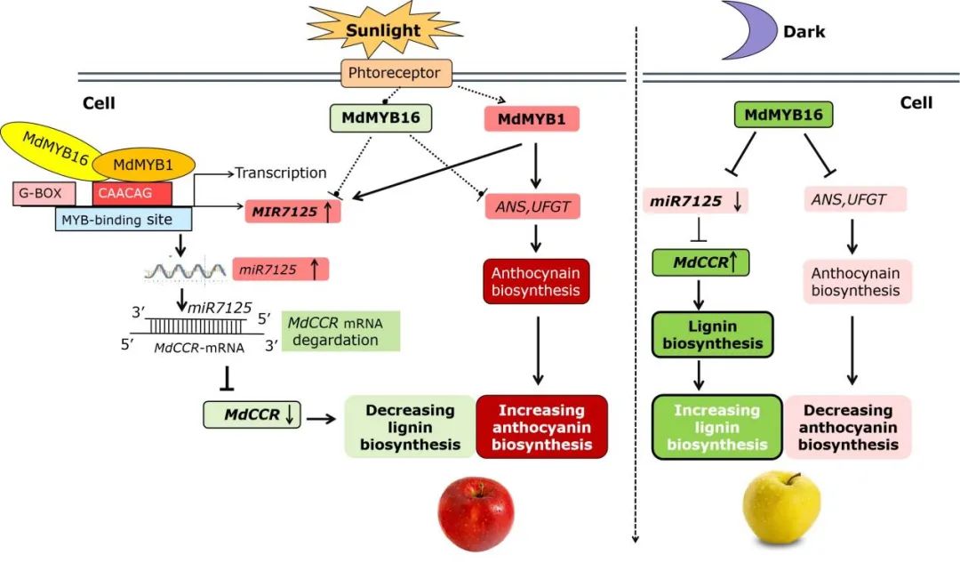 2021年4月28日,New Phytologist在线发表了北京林木分子设计与辅助育种高精尖中心、122cc太阳成集团青年教师胡玉净为第一作者、张杰教授和姚允聪教授为通讯作者的题为“The MdMYB16/MdMYB1‐miR7125‐MdCCR module regulates the homeostasis between anthocyanin and lignin biosynthesis during light induction in apple”的研究论文。该研究揭示了MdMYB16/MdMYB1‐miR7125‐MdCCR模块协同调节光诱导苹果果实花色苷和木质素生物合成之间的稳态。并突出展示了CCR和CHS基因催化共同底物介导木质素和花色苷生物合成的竞争关系,为脱袋后苹果果实快速着色和品质形成分子机制提供了新的认识。