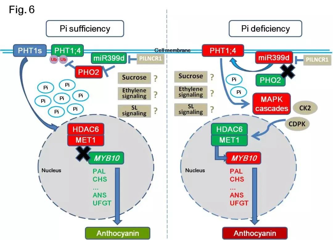 2019年12月13日,Plant Cell and Environment杂志在线发表了122cc太阳成集团姚允聪课题组题为“MiR399d and epigenetic modification comodulate anthocyanin accumulation in Malus leaves suffering from phosphorus deficiency”的研究论文。该研究揭示了miR399d、HDA6和MET1共同调控的苹果属叶片缺磷胁迫下花色苷积累的分子机制。