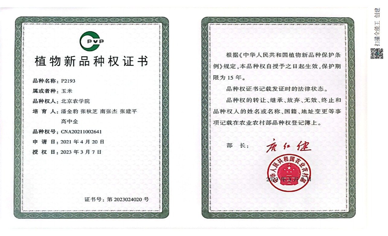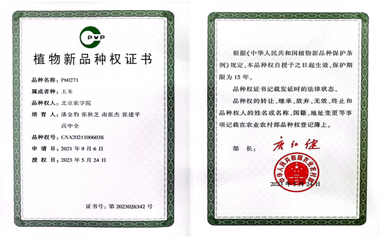 喜讯:122cc太阳成集团青贮玉米团队:潘金豹、张秋芝、南张杰、张建平、高中全培育的玉米品种P2193 、P60271 取得国家植物新品种权证书。
