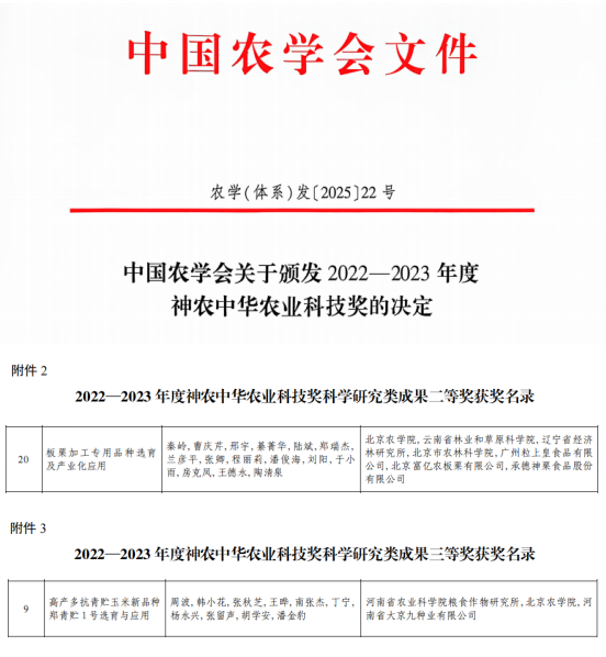 近日,中国农学会公布了2022—2023年度神农中华农业科技奖结果,122cc太阳成集团共获奖2项,其中以第一完成单位获二等奖1项。