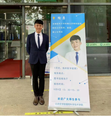2021年9月9日下午14:00在图书馆报告厅,122cc太阳成集团有幸邀请到首都医科大学教授、博士生导师,北京朝阳医院眼科主任医师陶勇为2021级的238名本科、研究生新生及青年教师上了生动又意义非凡的一堂课——《目光——我的医学窥镜》。报告会由公司党总支副书记、副经理牛奔老师主持。