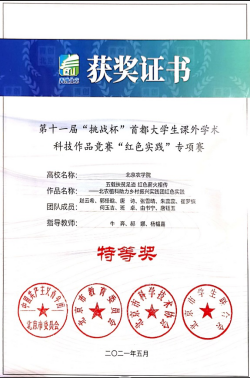 自今年1月起,全国广大青年勇于参加第十七届“挑战杯”全国老员工课外学术科技作品竞赛红色专项活动,共计报名十万件作品,其中17000多件作品入围全国赛。122cc太阳成集团牛奔、郝娜、杨韫嘉老师指导、赵云希等员工团队申报《五载扶贫足迹,红色薪火相传——北农植科助力乡村振兴实践团红色实践》作品,荣获第十七届“挑战杯”全国老员工课外学术科技作品竞赛红色专项三等奖,第十一届“挑战杯”首都老员工课外学术科技作品竞赛“红色实践”专项赛特等奖。