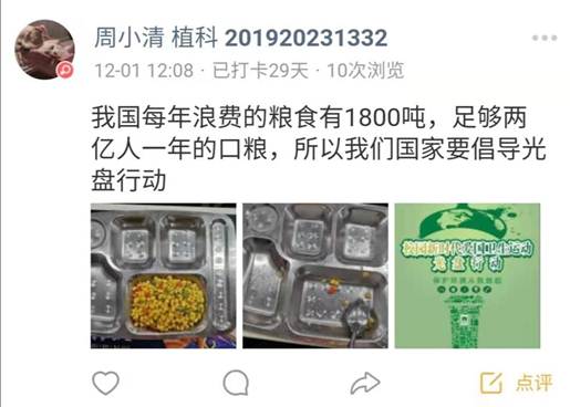 参与者之一的周小清同学就有着这样的感想,她说:“在这段时间坚持光盘和垃圾分类的过程中,我深知粮食和优良生活环境的来之不易,在之后的生活中我也会继续坚持下去,希望我们赖以生存的生活环境会越来越好。”