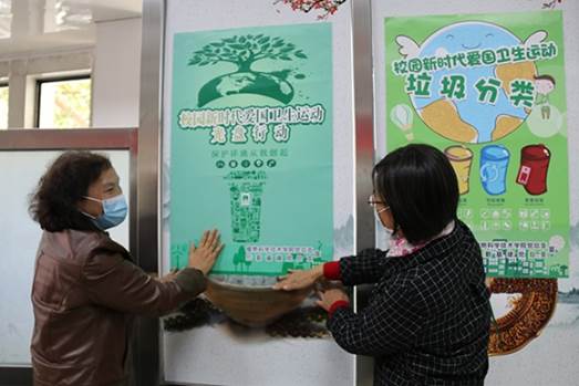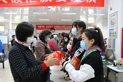 仪式上,后勤基建党总支书记张秋芝、公司党总支书记王绍辉共同张贴“校园新时代爱国卫生运动光盘行动——保护环境从我做起”宣传海报,分别为志愿者们颁发志愿监督员与工作牌,志愿者与领导们在横幅下合影,光盘行动正式启动。
