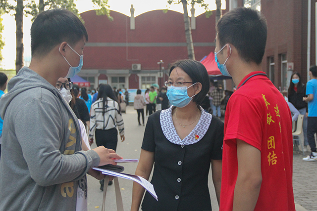 2020年9月13日,2020级辅导员贾慧敏、班主任孙璐璐、彭真、李玮瑜、王程与团学组织成员、2020级年级组长、各班班助和志愿者们,开始迎接今天报到的京内本科新生。