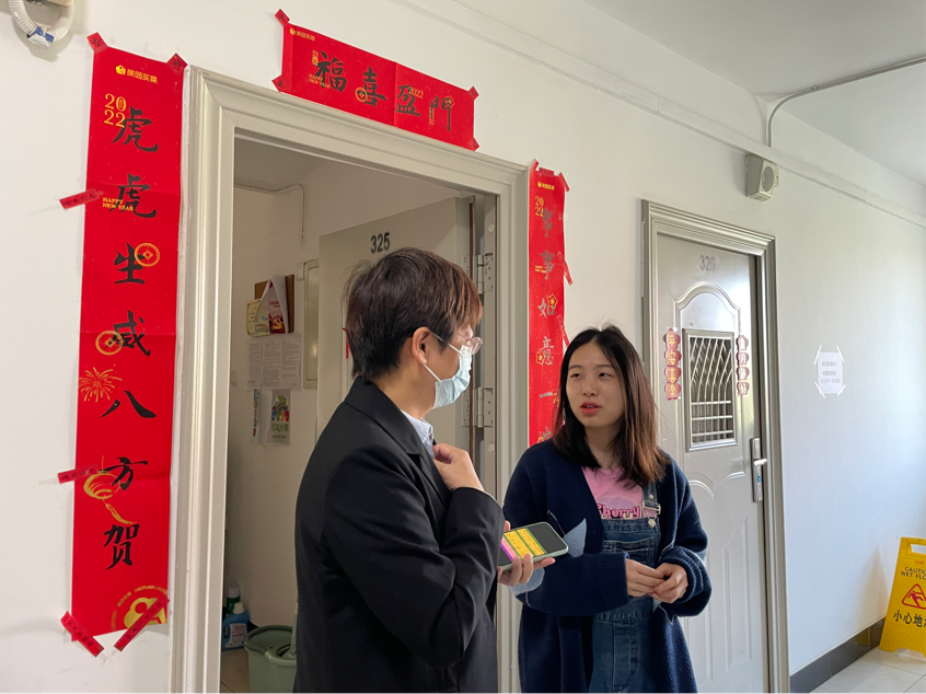 4月15日和18日,在研究生辅导员贾慧敏的陪同下,研究生导师邢宇、王晓琴教授走进研究生宿舍,分别走访了15位员工的15个宿舍。排查了各个宿舍存在的安全隐患,检查了宿舍的卫生。同时,向员工强调了新冠疫情期间个人防护的重要性,关心了员工在生活、心理及实验等方面的情况,询问了毕业生的就业去向等相关问题。在走访宿舍中,对员工生活中存在的困难更进一步了解,也拉近了老师和同学的关系。