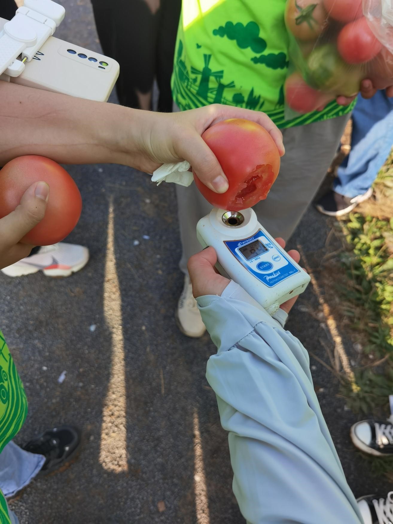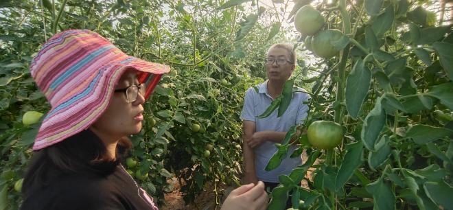 随后,实践团来到由园艺系教授王绍辉帮助引进番茄新品种的种植基地。员工们通过品质测定实验发现番茄京番308、番茄京番309两个品种可溶性固形物含量相对较高,为9.4%,且其果形较小,口感较好,适于鲜食;京番401果形较大,抗性相对较强,果皮较厚,适于熟食。且引进新品种的销售单价为当地番茄品种的2.5倍,为当地农户带来了更好的产值及经济收益。